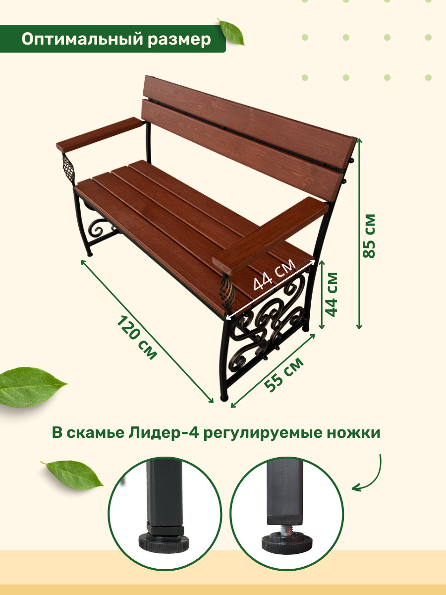 Сиденье лавочки изготовлено из дерева с влагостойкой пропиткой махагон, которое приятно на ощупь и выглядит эстетично. Цвет каркаса и оттенок дерева гармонично сочетаются между собой, создавая универсальный вид скамейки. Скамейка имеет регулируемые ножки, что позволяет установить ее на любой ровной поверхности. Спинка лавки легко крепится к каркасу болтами и гайками. Поставляется в разобранном виде. Надежные элементы крепления на болты с заглушками обеспечивают устойчивость конструкции и предотвращают ее повреждение влагой. Она пригодна для круглогодичной установки на улицу. Размеры деревянной скамейки (1200x550x850 мм) позволяют комфортно разместить на ней до трех человек.